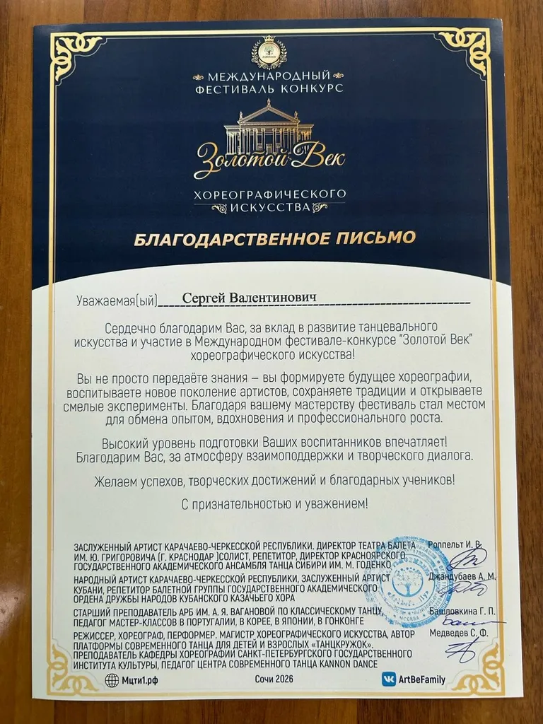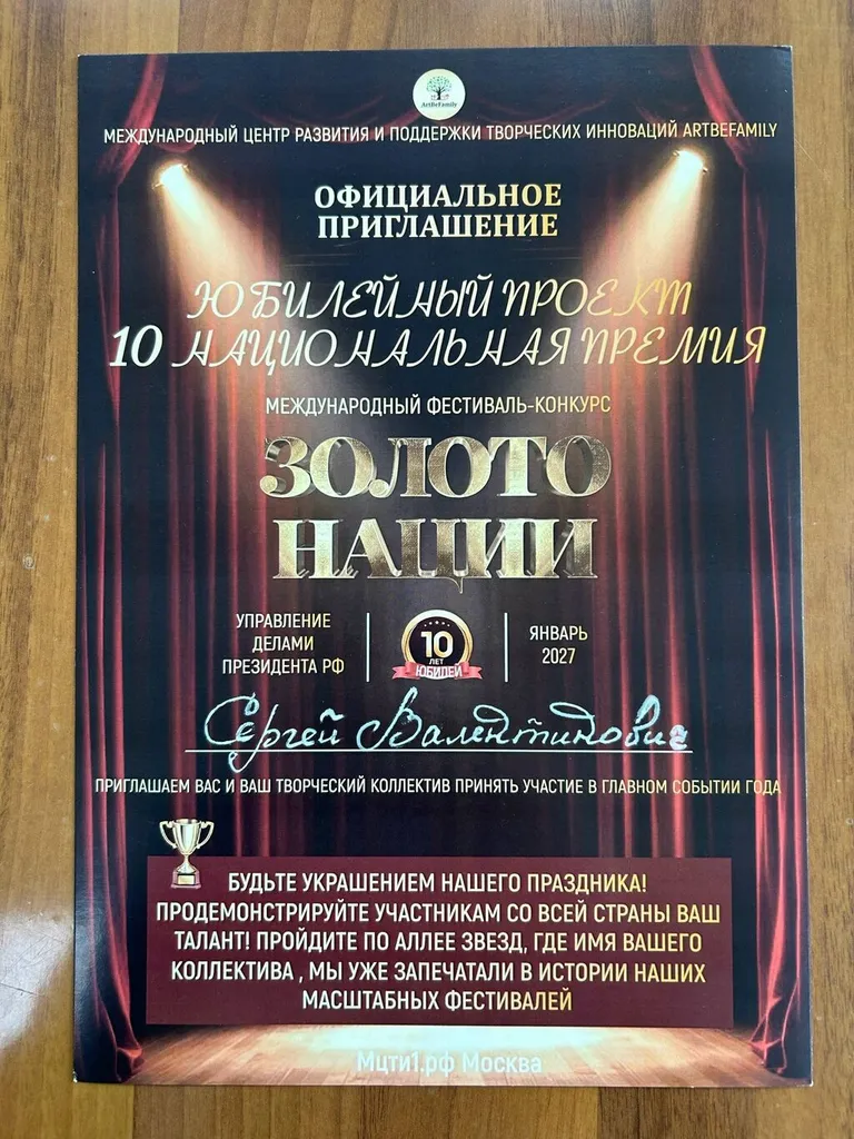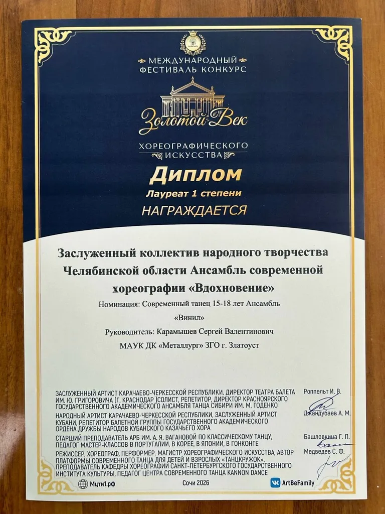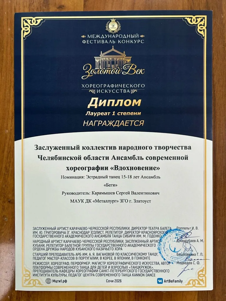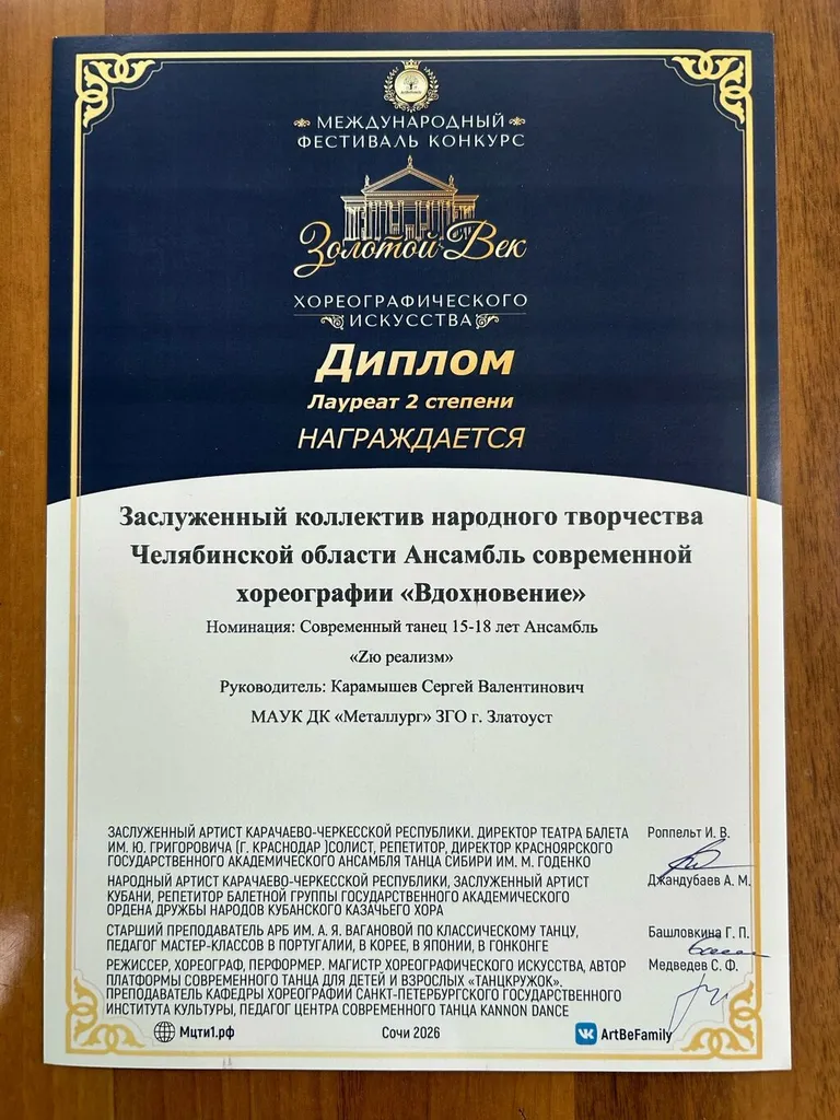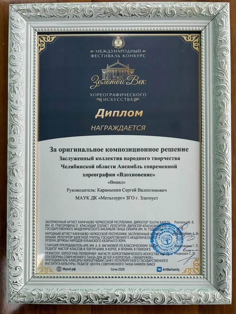 Именным Благодарственным письмом отмечен руководитель ансамбля "Вдохновение" Сергей Карамышев. Кроме того, златоустовцы получили приглашения на крупные события фестивального движения в 2027 году.
