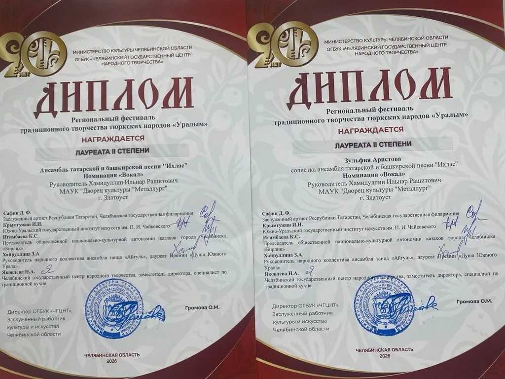 Большое событие состоялось 11 апреля в Миассе. И в копилке наших артистов - отличные результаты! Ансамбль татарской и башкирской песни "Ихлас" (руководитель Ильнар Хамидуллин) стал обладателем четырех дипломов:
